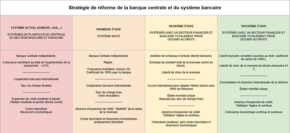 La première phase d’une stratégie de bitcoinisation volontaire consisterait à discipliner radicalement le système existant. La banque centrale serait maintenue, mais enfermée dans des règles strictes et non discrétionnaires. La croissance monétaire serait limitée à un niveau proche de la croissance de long terme de l’économie, autour de 2 %, et surtout, le système bancaire serait contraint à un coefficient de réserve de 100 %. Autrement dit, les banques ne pourraient plus créer de monnaie à partir du crédit. Elles deviendraient juridiquement responsables des dépôts qu’elles conservent et des prêts qu’elles accordent. Une telle réforme transformerait profondément la dynamique économique. L’expansion artificielle du crédit disparaîtrait, les cycles de boom and bust seraient quasiment éliminés et la valeur de la monnaie se stabiliserait. Cette étape est cruciale, car elle prépare mentalement et institutionnellement les acteurs économiques à un monde sans manipulation monétaire permanente. Elle permet une transition sans choc, en éliminant progressivement la principale source d’instabilité du capitalisme moderne